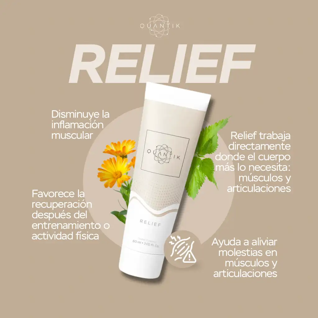 QUANTIK RELIEF está diseñada para ayudarte a proporcionar una sensación de bienestar y alivio para esos dolores musculares y articulares propios de los desgastes corporales o lesiones deportivas.