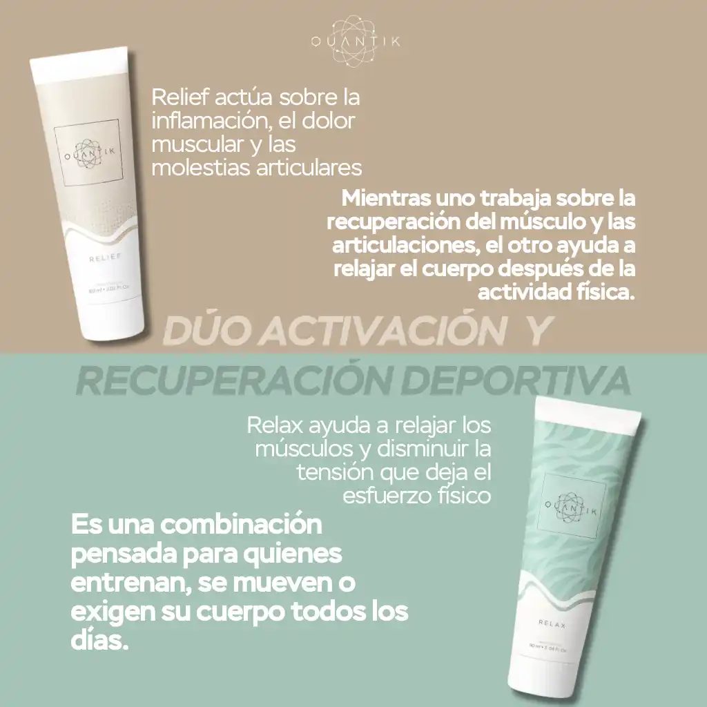 Por su parte, Quantik Relief actúa cuando el cuerpo necesita un alivio más profundo. Su fórmula con ingredientes como árnica, romero y menta piperita está pensada para acompañar momentos de mayor exigencia muscular o molestias más intensas en músculos y articulaciones, aportando una sensación de alivio y frescura en las zonas más cargadas.